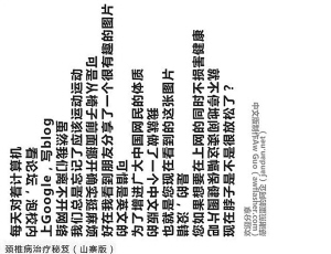 網(wǎng)上的“山寨版頸椎病治療秘笈”雖然版本眾多,但打開看看,其實(shí)都是“躺倒”的文字隔行穿插排列,想全部讀下來,必須把頭左歪歪再右歪歪。版主們稱,就在這歪頭的過程中,不用離開椅子和電腦,不知不覺地就鍛煉了頸椎,預(yù)防了頸椎病的發(fā)生,“特別適合天天上網(wǎng)的朋友”!吧秸骖i椎病治療秘笈”的原理就是左右扭動(dòng)脖子,在左右運(yùn)動(dòng)中鍛煉頸椎。