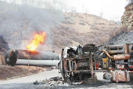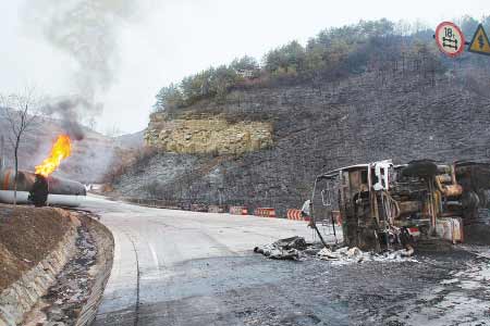 在現(xiàn)場記者看到,這輛油罐車車體已經(jīng)分離,傾倒在公路一邊的油罐仍在燃燒,濃煙有10米多高.兩邊山上被閃爆引燃的山火已經(jīng)被控制.公路右側山上一戶村民家存放的2萬多公斤玉米全部被引燃.