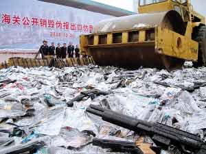 近日,在汕頭海關舉行的公開銷毀走私仿真槍現(xiàn)場會上,43款共計42762支仿真槍和配套塑料BB彈9.6噸被壓路機碾壓銷毀。