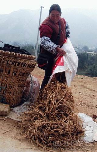 40多歲的魏永珍是任家坪村人,她麻利地將麻袋中還粘著泥土的當歸倒出來任人挑選,以1.5元/斤的價格賣出。這個價格,是去年同期他們賣給下鄉(xiāng)收購“小老板”的批發(fā)價。他們所在的地段,不斷有游客走過,走到北川老縣城外的“新三倒拐”看地震遺址,很多人會停下來買些當歸。屢次來此買過當歸的王師傅說,這里的當歸味道很正,有一種純正的甜味。魏永珍笑嘻嘻地說:“我們這里當歸好,路過的人都來買,生意多好!币换仡^,她指著遠處大面積的山說,地震已讓家園盡毀,原來用于種當歸的地都毀得差不多了:“本來可以產(chǎn)600斤左右,現(xiàn)在就剩了點邊角了,差不多只有100斤左右!