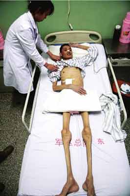 昨天下午,記者在軍區(qū)總院普外科病房見到了耿松峰,他雙臂向上彎曲放在枕邊,右側(cè)肩部正進(jìn)行靜脈營養(yǎng)注射,一袋普通塑料袋大小的乳白色液體已經(jīng)見底。他說話吃力,但仍然翕動(dòng)著嘴唇說:“伯伯(指普外科主任)是個(gè)好人。”身高1.72米、體重曾60公斤的他現(xiàn)在只有33公斤,大腿也只有成年男性手腕粗。他母親用極不流利的普通話說,因?yàn)閮鹤拥牟,已?jīng)家徒四壁,親戚、高利貸,各種借錢的方法都想到了,已經(jīng)花了20多萬,可還是不夠,兒媳也因此要離婚!艾F(xiàn)在已經(jīng)欠醫(yī)院5萬塊錢了,可我也不能看著兒子死啊”。