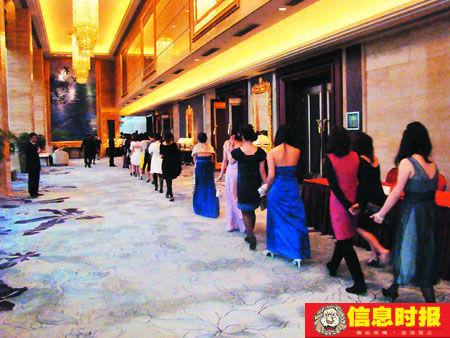 1月10日晚,備受關(guān)注的廣州史上最昂貴的“世紀(jì)佳緣.名仕之約”相親會(huì),終于揭開了神秘的面紗,在廣州一家五星大酒店里,從6000多名報(bào)名者中脫穎而出的40名美女,嚴(yán)冬之下穿著單薄、靚麗的晚禮服,邁著貓步,擺出媚態(tài),供30名鉆石王老五們鑒賞。[1月11日[[信息時(shí)報(bào)]]]