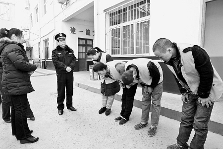 4個騙子昨日站在辛家廟派出所的院子里,面對受害人大梅悲憤的責(zé)問,一起給大梅深深地鞠躬表示道歉。