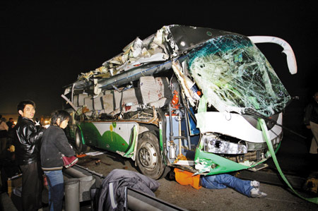 晚上10時許記者趕到現(xiàn)場時,見到一輛車號為贛A16230的大客車停靠在高速公路慢車道上,車身右側(cè)殘破不堪———車門被擠扁,車輪以上的車身外殼已被完全刮掉,右側(cè)前六排座椅皆扭曲變形,上面沾滿血跡。地面上有多處大攤血跡,散落的乘客物品隨處可見。