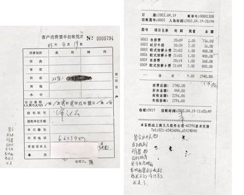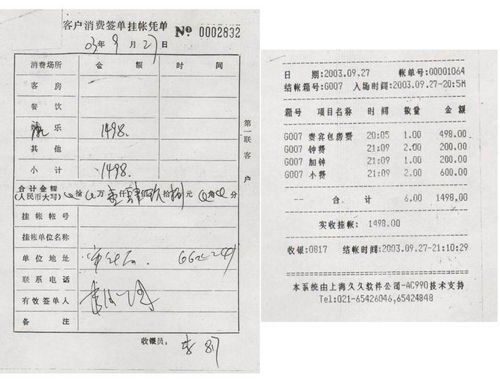 結(jié)賬小票上列明的服務(wù)包括貴賓包房費(fèi)、鐘費(fèi)、加鐘、小費(fèi)、飲料等。第一次消費(fèi)的時(shí)間為2003年4月19日,入場(chǎng)時(shí)間為晚8點(diǎn)09分,結(jié)賬時(shí)間為晚9點(diǎn)05分?傁M(fèi)金額為2296元。其中,包房共計(jì)3間,費(fèi)用為1104元(368×3);歐式按摩小費(fèi)共有3筆,其中兩筆分別為400元,另一筆則標(biāo)明數(shù)量為2,金額為800元。另一份賬單的時(shí)間為2003年9月27日,入場(chǎng)時(shí)間為晚上8點(diǎn)03分,結(jié)賬時(shí)間為晚9點(diǎn)10分?傁M(fèi)金額為1498元。其中“貴賓包房費(fèi)”是498元,鐘費(fèi)是200元,加鐘是200元,小費(fèi)是600元。