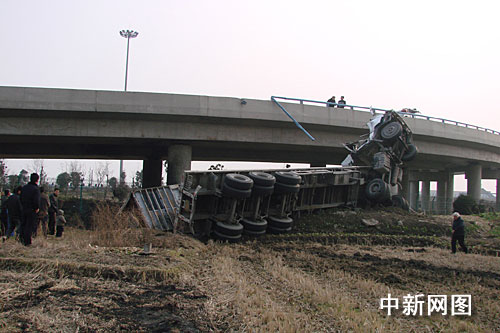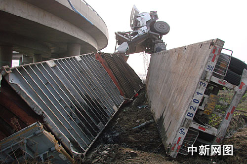 中新網(wǎng)湖州1月23日電(記者袁爽 通訊員汪焱)近日,一輛重型集裝箱半掛車在途經(jīng)申蘇浙皖高速公路皖向織里下主線匝道處時,不僅超速行駛,更是嚴(yán)重超載超限,結(jié)果該車在高速路上玩起了“變形金剛”,釀成慘劇。據(jù)了解,出事車輛碰撞右側(cè)護(hù)欄后翻下落差7米的橋梁。記者俯瞰現(xiàn)場,該車就像是美國大片《變形金剛》里躺下的擎天柱,所幸車上人員受傷較輕,無生命危險。