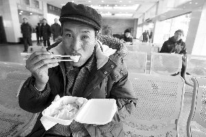 昨天11:00,記者來(lái)到中央門汽車站,站前廣場(chǎng)上空無(wú)一人。前天還像煮餃子一樣的候車大廳,只有稀稀拉拉的幾十個(gè)人。下午3:20左右,車站端出了為旅客精心準(zhǔn)備的“年夜飯”:一鍋餃子,共40碗分盛給站內(nèi)的每一位旅客。一位前往南通的老漢邊吃邊笑呵呵地說(shuō):“好吃,真好吃!15:40,隨著南京到南通的最后一班車徐徐駛出,車站歸于了平靜。年前的春運(yùn)就這樣順利落幕了,沒(méi)有一名旅客滯留在車站。車站人士介紹,昨天一天的客流量約在5000人次,僅是24日的1/12。