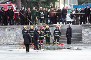 事發(fā)現(xiàn)場(chǎng),吞噬了年輕男子的冰窟緊靠敬業(yè)湖南岸。公安、消防人員將敬業(yè)湖緊鄰北洋道一側(cè)的湖岸封鎖,7個(gè)民警沿著親水平臺(tái)走上冰面,用竹竿在冰下摸索著。時(shí)間一分一秒地過(guò)去,救援人員找來(lái)一塊長(zhǎng)方形木板,當(dāng)作筏子艱難地破冰搜救。一個(gè)半小時(shí)過(guò)去了,救人的“筏子”漸漸向湖心移動(dòng),搜索的竹竿在一米一米地加長(zhǎng),但水下沒(méi)有一點(diǎn)動(dòng)靜。