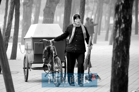 梁廣英說的是她的月工資。她在鄭州城西的碧沙崗公園做清潔工,已經有兩個月時間。不過,她不直接受雇于公園管理處,每月250元的工資,是由公園一名姓趙的清潔工給她開的。她幫他干活。