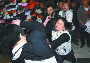 昨日9時(shí)30分,秀水街市場(chǎng)一樓層經(jīng)理帶著管理人員逐一實(shí)施封攤停業(yè)整頓,但剛到第一家攤位,就遭到商戶圍攻。