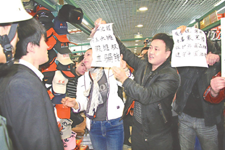 2月8日上午9點(diǎn)半,北京秀水街市場(chǎng)有限公司依據(jù)北京英特普羅知識(shí)產(chǎn)權(quán)代理有限公司向其提供的一份公證書(shū),以涉嫌售假為名,準(zhǔn)備對(duì)市場(chǎng)內(nèi)的7家商戶(hù)進(jìn)行封攤處罰。但在場(chǎng)商戶(hù)卻手持公證處的一份“證明”,強(qiáng)烈質(zhì)疑英特普羅代理公司出具的售假公證存在“證據(jù)不足”,并與市場(chǎng)管理人員和保安發(fā)生沖突。