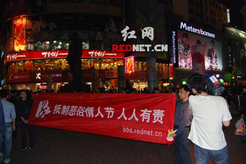 隨后記者采訪了活動的發(fā)起人,紅網熱心網友“小溪里的石頭”,他自稱姓唐,是身在長沙的一名上班族,在9日的時候曾在紅網論壇上寫過一個《跟我們來,到黃興路共同抵制惡俗情人節(jié)》的帖子,在網上征集網友來到街頭抵制情人節(jié)。網上得到許多人支持,不過,最終答應來現場支持的只有兩三個網友,這也是始料未及的,對于是否炒作一說,該網友表示,自己不是炒作,目的只是提醒人們關注民族節(jié)日。