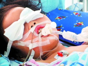 黃蓉今年6歲半,四川人。上了呼吸機的黃蓉被蒙著雙眼,躺在病床上,雖然有心跳,但對外界的刺激毫無反應。主治醫(yī)生說,其病情危重,“已接近腦死亡”。