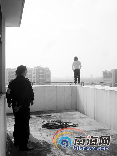 2月5日,阿春聽從記者的勸說,當天就從?诜祷嘏R高的家里。結(jié)果,家人與阿春大吵了起來。阿春在家里呆不住,于2月6日中午從臨高趕到?,隨即來到?谀仙陈芬粭澊髽堑臉琼,站在樓頂?shù)倪吘墱蕚涮鴺亲詺ⅰ?/p>