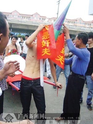 據(jù)了解,這支迎親隊伍當(dāng)日中午從大沙田出發(fā),沿著星光大道、白沙大道,走上葫蘆鼎大橋,最后到達目的地竹溪大道某飯店。迎親隊伍在行進途中十分引人關(guān)注,不少市民拿出相機、手機拍照。可能是覺得不好意思,新娘悄悄把身后的“我是淫婦”取下,用手中的鮮花擋住。到達目的地后,新郎大呼一聲:“其實我不是奸夫!”接著脫掉綠帽、紅綢,將新娘背進飯店。記者注意到,此時的新郎身上已經(jīng)留下了幾道被竹條抽打的痕跡。