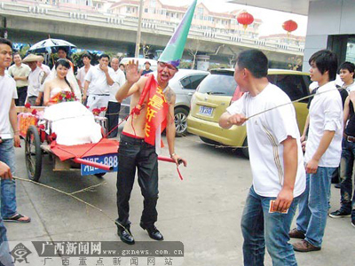 兩位新人的老鄉(xiāng)趙先生參與策劃了這次接親活動!斑@樣惡搞其實就是圖個熱鬧!”趙先生告訴記者,在老家邵陽,每家人迎親時都要大鬧一番,形式不限,花樣翻新,越熱鬧越好,“有句話叫‘結(jié)婚三日無大小’,說的便是結(jié)婚那幾天不必計較輩分,誰都可以拿來惡搞。因此,新郎的父親也被拉進迎親隊伍,甚至遭到‘鞭打’。而新郎在迎親當(dāng)天一定要吃夠苦頭,有車不能坐,要拉著新娘走,被鞭打更是家常便飯”。