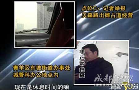 近日,成都電視臺(tái)《真相30分》欄目組接到神秘舉報(bào)電話。對(duì)方舉報(bào)城管收取好處費(fèi),對(duì)出攤占道視而不見。對(duì)此,記者專門進(jìn)行了暗訪。成都全搜索網(wǎng)站記者通過影像資料發(fā)現(xiàn),城管執(zhí)法人員不僅有對(duì)出攤占道經(jīng)營(yíng)故意睜一只眼閉一只眼的嫌疑,還暴露了城管管理缺失的問題。