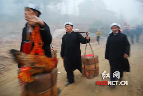 天還沒亮,新郎唐德武家的迎親隊(duì)伍便抬著花轎前往十多里外的銅錢坪村迎接新娘,和普通婚禮不同的是新郎并不在迎親隊(duì)伍中,帶隊(duì)的是花瑤婚嫁風(fēng)俗中特有的“媒人公”。在距離新娘家不遠(yuǎn)的地方擺下有辟邪含義的“五子飛棋”之后,三道攔門酒成了“媒人公”必須通過的考驗(yàn)。對(duì)歌、打蹈(新娘家的女性跳坐在媒人公膝蓋上)、打泥巴(將田里剛挑來的泥巴涂抹在“媒人公”身上),每個(gè)花瑤婚嫁元素都按照傳統(tǒng)習(xí)俗上演。一把由“媒人公”帶來、被新娘家掛上繡球的花傘是花瑤婚俗中最有特色的信物,它象征著新娘將自己的愛情隨著花傘送到新郎手中。