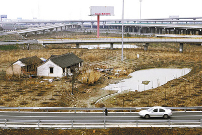 跨過(guò)一張已經(jīng)被撕裂的鐵絲網(wǎng),快速奔過(guò)兩條雙向六車道的高速公路和往上海方向的匝道,那呼嘯而過(guò)的車輛讓我不寒而栗。強(qiáng)壓住內(nèi)心的恐懼,繼續(xù)翻越往杭州方向的匝道,往前三百米,又穿越高架匝道,邁過(guò)雜草叢生、凹凸不平的地面,再往里前行二百米后,隱約看見一戶被條條匝道環(huán)繞著的小屋。據(jù)村民介紹,這條“長(zhǎng)征路”是唯一能到達(dá)王來(lái)英家的“通途”。