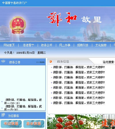 24日晚10時(shí),記者在晉寧縣政府門戶網(wǎng)站()上看到,網(wǎng)站首頁(yè)充斥著幾十行“俯臥撐、打醬油、躲貓貓,武林三大絕學(xué)!”的字樣,公示公告、政務(wù)信息、領(lǐng)導(dǎo)講話、政務(wù)文件、政策法規(guī)、統(tǒng)計(jì)數(shù)據(jù)、招商引資、文化旅游等欄目原有的內(nèi)容都被替換成“俯臥撐、打醬油、躲貓貓,武林三大絕學(xué)!”。除了一些圖片無(wú)法刪改外,所有的文章標(biāo)題、圖片的注釋也都被改為以上字樣。