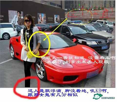 疑點(diǎn)二:從照片中女子與法拉利之間的距離,以及人與車的大小比例看,照片有明顯的PS痕跡。女子的腳甚至沒有拍進(jìn)照片內(nèi)法拉利旁的地面上,這從整個(gè)照片的拍攝角度來看,是不可能的。