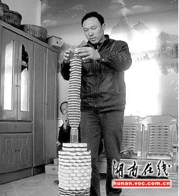 彭樹炎說自己不喜歡打牌,8年前的一天,彭樹炎偶然聽說有人能用一個麻將子頂起一副麻將,不覺對壘麻將產(chǎn)生了興趣,就在家里嘗試起來。從兩副、三副……漸漸增加到二十多副,同時,壘出的花樣也不斷翻新!叭绻腥藙(chuàng)造了這方面的吉尼斯世界紀錄,我想去打破這個紀錄!(湖南在線-三湘都市報 記者 劉曉波 通訊員 白楊)