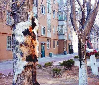 近日,在天涯、華商網(wǎng)等各大論壇都可看到這樣一個帖子——《慘無人道,殺死流浪貓吃肉后還剝皮綁在樹上》。點擊進去可以看到,在某小區(qū)一戶人家門前的樹上,兩張貓皮一左一右被綁在那里,繩子分別從嘴部和尾部勒過。