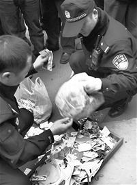 上午10時(shí)40分,警方將老人從樓上扔下的錢、名片、光盤(pán)等東西一一收拾好帶走,以作進(jìn)一步調(diào)查。