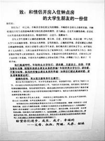 原公開信就貼在南京仙林大學城文苑路某高檔小區(qū)門口,信中告誡大學生不要“為了一時之歡,不顧養(yǎng)你們的親人的期盼,不顧給社會人才的榜樣形象,不顧給我們?nèi)粘I畹挠绊懀诰用裥^(qū)內(nèi)成雙成對地進出……”公開信還提醒提供日租房的小區(qū)業(yè)主“不要為蠅頭小利替他們愚蠢的沖動提供溫床了!”信件的落款是“盼望你們進步、成長、成才、幸福的父母、叔叔、阿姨、兄弟、姐妹!