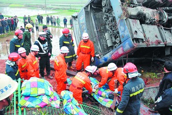 附近村民聞訊后,也紛紛趕來協(xié)助交警救人。但由于近來連續(xù)降雨,護坡非常濕滑,給救援工作帶來了極大困難。官兵們采用了救生繩施救的辦法,將兩根救生繩拴在護欄上,利用救生繩往路面運送擔架上的傷員。至上午8時30分,全部傷員被救出并送往醫(yī)院救治。11時40分,事故車輛被拖離出事地點,為實施救援而實行交通管制的京珠高速株洲段恢復(fù)正常通車。