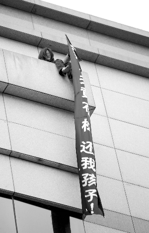 記者看到,一名身穿紅色外套的年輕女子,正坐在樓頂外墻伸出的一小塊天臺邊緣,垂著頭發(fā),兩腳懸空,一只手抓著手機,另一只手拉著一條條幅,上面寫著“還我孩子”等幾個白色大字。圍觀的人越來越多,記者回頭望去,只見淮海路一側的自行車道上,整片黑壓壓的腦袋。