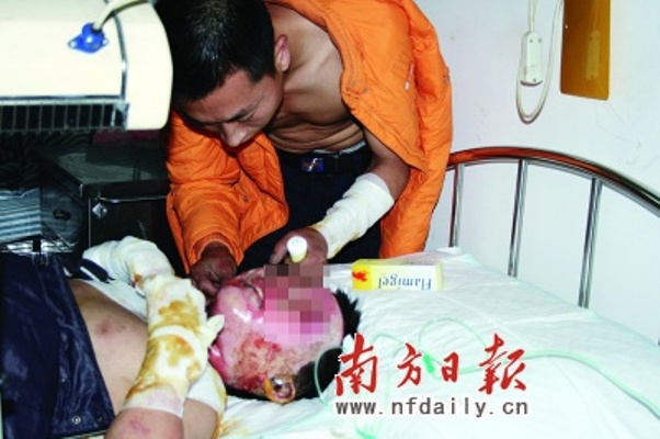 還來不及驚叫,母子倆周身便被大火包圍。離開不到半小時(shí)的父親想不到,家中一切已付之一炬。他當(dāng)然來不及多想,立即將衣服正在燃燒的妻子抱到水池邊,接過水直接潑向妻子,之后是9歲的小中林。消防車和救護(hù)車很快到來,火勢(shì)得到控制,而這一家三口也被送到武警醫(yī)院。