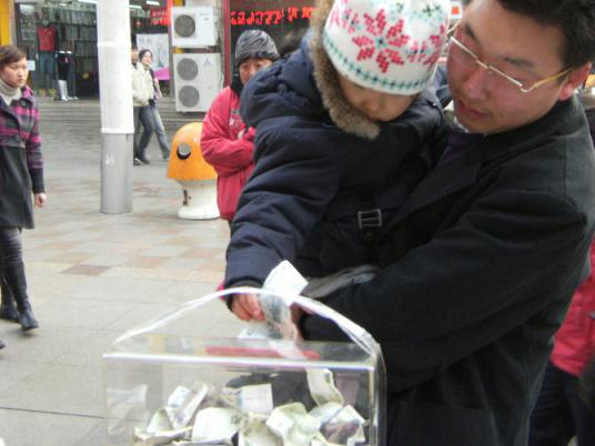 “我和我的好姐妹王靜一起,在青島市區(qū)準備組織這次捐款活動!眲⒈恼f,“開始的時候由于城管管理的比較嚴格,所以只能通過市北區(qū)紅十字會協(xié)調(diào),最后允許我們的捐款活動可以組織兩天!