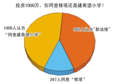 截至昨天下午5時,大渝網發(fā)起的調查顯示,你認為修建第一高塔有必要嗎?2475人參與投票,1154位網友認為“沒必要,又是面子工程”;1091人認為“為了導航,也能增添新景觀”。在“投資1000萬,你同意修塔還是建希望小學?”的調查中,網上2271人參與投票,1009人認為“同意建希望小學”;267人同意“修塔”。