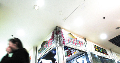 昨日中午,記者在現(xiàn)場發(fā)現(xiàn),其主要通道和許多門市的墻面上開始清晰地出現(xiàn)大小不一的裂縫。“感覺像每天都在經(jīng)歷地震!贝笃航鹣笫兰业叵律虉鯟區(qū)105號商戶趙庭明指著頭頂附近的一條裂縫說,前天上午,巨響突然傳來,一位恰巧經(jīng)過的老太以為發(fā)生地震嚇得當(dāng)即蹲倒在地。