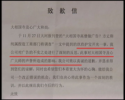 源杰法師告訴記者,廣告中所播放的開光畫面,是大相國(guó)寺當(dāng)時(shí)正在舉行的一個(gè)法會(huì)的場(chǎng)面,記者找到了廣告中正在開光的三名法師,演一法師告訴記者,曾有人拍攝過他正在開光時(shí)的場(chǎng)面,但他絕對(duì)不是為什么產(chǎn)品開光。