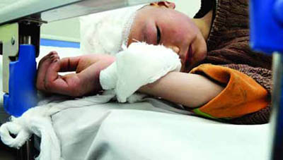 另一個(gè)受害孩子的家長楊旗中正趴在ICU病房的門口,兒子楊自炎剛動完腦部手術(shù)。為了防止孩子亂動,兩只小手被捆在了床旁的護(hù)欄上。