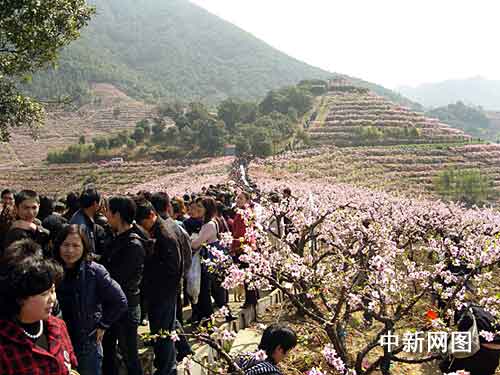 中新網(wǎng)寧波3月24日電 (記者 張慧慧 實習(xí)生 趙雪梨 通訊員 馮峰)3月24日上午,2009中國奉化桃花節(jié)暨第七屆蕭王廟桃花筆會在浙江奉化開幕。一大早,當(dāng)?shù)赝跫疑缴弦咽侨祟^攢動,記者只能隨著“大部隊”緩慢前行。登上山頂,放眼望去,成片的桃花延伸到每一個山谷,山間小路游人如織,場面頗為壯觀。
