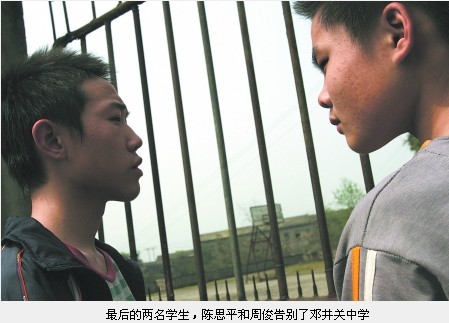 3月22日,陳思平和周俊,鄧井關(guān)中學(xué)的最后兩名學(xué)生,在學(xué)校門(mén)前站立半晌后轉(zhuǎn)身離去。這個(gè)讀了三年的學(xué)校從此不屬于他們。教育部門(mén)給他們聯(lián)系到一所職業(yè)中學(xué)就讀。十天前,富順縣鄧井關(guān)中學(xué)因“14名教師教2名學(xué)生”的狀況而名聞一時(shí),被網(wǎng)友戲稱(chēng)為“史上最牛中學(xué)”。最后的兩名學(xué)生終于走了,鄧井關(guān)中學(xué)在為眾人所知后,悄然謝幕。