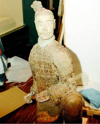 據(jù)陜西歷史博物館館長(zhǎng)成建正介紹,這件綠面跪射俑即使在兵馬俑博物館也僅展出過(guò)一次,平時(shí)都是用布將兵馬俑包裹起來(lái)的。該俑是考古隊(duì)在1999年9月10日在二號(hào)坑發(fā)現(xiàn)的。整個(gè)兵馬俑身上都施以彩繪,尤其是面部彩繪完整,白色眼白,黑色瞳孔,雙眼炯炯有神。不同于其他陶俑的淡粉面色,淡綠面色尤其引人注目。該俑的出土,引起了文物專家的爭(zhēng)論,誰(shuí)也不能確定為什么這尊俑的面部要施以綠色顏料,甚至有人猜測(cè)“綠面”有可能是工匠們的惡作劇。