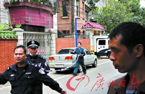 昨日中午,記者趕到現(xiàn)場,高為5層的33號大門緊閉,院內(nèi)站滿民警,門前排了11輛警車。記者觀察發(fā)現(xiàn),距離33號不到100米就是廣州最為繁華的地帶之一——五羊新城內(nèi)的達道路,路上車輛穿梭往來,周邊分布著廣州各大單位。距離33號大院的路對面,成排的老別墅被重新裝修一新,里面駐扎著數(shù)間公司,營業(yè)范圍有廣告、律師等行業(yè),白天人流不少。