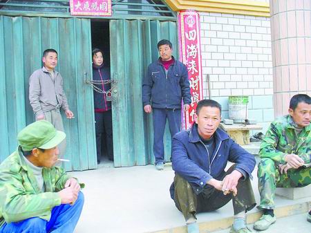 昨日上午,記者來到許德成家,院子里有幾名男子,房門被一根鐵鏈鎖住,一名女子扒著門縫向外看(如圖),許德成也在屋內。