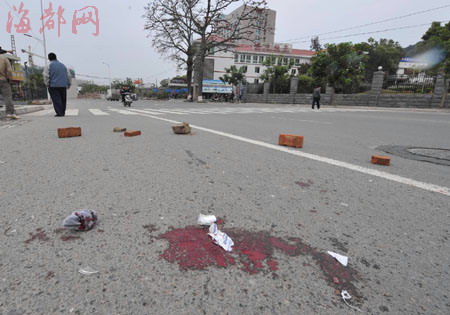 記者趕到現(xiàn)場(chǎng)時(shí),老人剛被送往醫(yī)院,路面上滿是血跡。警方正在用磚頭圍著的事故現(xiàn)場(chǎng)勘查!爱(dāng)時(shí)那名老人從分院走出來(lái),過(guò)斑馬線時(shí),一輛摩托車從他后面撞了上去!币荒繐粽哒f(shuō),那輛“黑色,很新”的摩托車速度很快,“老人被撞得飛起,在地上滾了幾下,躺在路上呻吟著,頭上、腳上都是血!