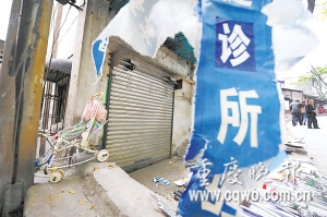 昨日,記者在現(xiàn)場看到,王氏診所位于前驅(qū)路公路邊一棟民房的底樓。診所卷簾門緊閉,在一張撕得零碎不堪的藍(lán)色布條上,寫著“王氏按摩診所”、“推拿、按摩”等字樣。