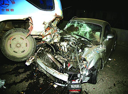 7日零時10分許,一車牌為魯BME5XX的奧迪TT跑車,在沿東西快速路由東向西方向行駛至三百惠附近時,因超車與前方一輛同向行駛的中巴車相撞,由于沖擊力巨大,兩車騰空而起飛出數(shù)米遠(yuǎn)后墜地,落在一輛原本與中巴車并列行駛的出租車前。“我還沒反應(yīng)過來,就聽到‘砰’一聲,兩輛車從天而降,落在我的車前方不遠(yuǎn)處,我趕緊剎車!笔潞蠼邮芙痪{(diào)查的目擊者、一名出租車司機(jī)回憶道。據(jù)另一位目擊者王先生稱,當(dāng)時他駕車以每小時90公里的速度行駛,只見一個銀灰色的影子從自己車后竄到前面,估計(jì)車速在每小時140公里以上,該車與前面的中巴相撞時,沒有采取任何減速措施,基本是踩著油門撞上的,隨后就見到一白色的影子被甩出奧迪車,摔在路上。