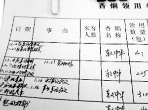 在一份招待用煙流水賬中,從2008年11月至2009年2月期間,招待用煙共用去了5277包,近530條。每個月的招待用煙數(shù)量都超過了1319包,均為中華香煙,有硬盒有軟包,按均價每盒50元算,相當(dāng)于每月要花銷6.6萬元。記者發(fā)現(xiàn),其中用煙數(shù)量最多的是今年的1月份,共用去2789包中華牌香煙,約為280條。在這份招待用煙的流水賬最下方,則標(biāo)出了這四個月當(dāng)中招待用煙數(shù)目出現(xiàn)了超支,多用了1934包。