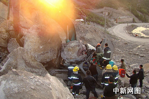 發(fā)生滑坡事故地點(diǎn)位于上屋采石場的半山腰,消防隊(duì)員攜帶破拆工具徒步上山。在現(xiàn)場,挖掘機(jī)被兩塊巨大的石頭壓得面目全非,駕駛室已被壓得完全變形。一名40多歲的司機(jī)被牢牢壓在駕駛室內(nèi),為防止再次滑落,幾名工人用鋼釬將巨石牢牢頂住。