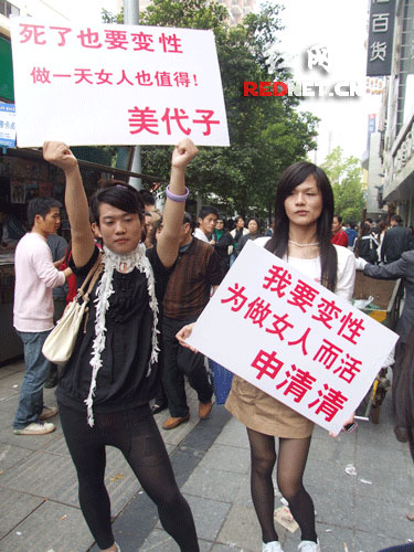 此時,申清清高舉一廣告牌稱“我要變性,為做女人而活”,而美代子的廣告牌上則顯示“死了也要變性,做一天女人也值得”,就連舉牌子的姿勢都“惹火撩人”,引得無數(shù)好奇的市民駐足。