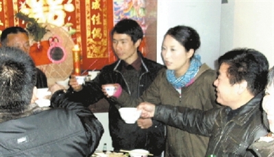 馬艷霞和童利祥是3月2日舉行的結(jié)婚儀式,貼在馬艷霞娘家大門上的一副對聯(lián)仍然鮮艷。馬艷霞的父親馬雙俊高興地給記者念對聯(lián):“愛情同勞動美麗,青春靠知識閃光”。