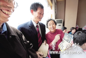 64級(jí)1班學(xué)生、在渝中區(qū)統(tǒng)戰(zhàn)部工作的王有惠為老師獻(xiàn)上一副題字,5班一位男學(xué)生奉上一幅書畫!斑@不是當(dāng)年的窮孩子馬慶嗎?”王忠篤說,馬慶父親早亡,母親獨(dú)自供養(yǎng)馬慶三兄弟,生活很困難。學(xué)校想辦法給他提供了每月8元的助學(xué)金,老師們也幫他湊生活費(fèi)!靶iL(zhǎng),我剛從渝中區(qū)商委主任和總工會(huì)主席的位置上退下來,以后會(huì)常來看您!61歲的馬慶含淚道。